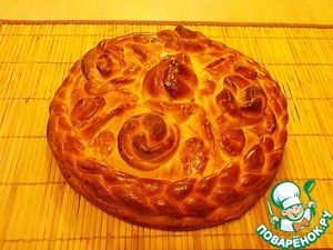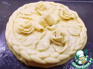 Затем уложил все эти украшения на основу каравая, пытаясь сделать что-то красивое. По внешней окружности каравая уложил косичку. Симметрично - четыре розочки, между ними - листики и т. д. Смазал сверху взбитым яйцом. Дал расстояться караваю полчаса в тёплом месте и уже после этого отправил его в предварительно разогретую духовку.