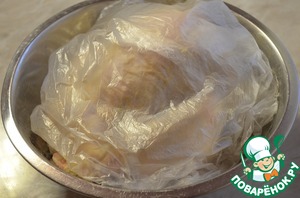 Укладываем курочку в миске с маринадом вниз грудкой, сверху накрываем пакетом и убираем в холодильник на 3-4 часа. Будет хорошо, если курочку замариновать с вечера.