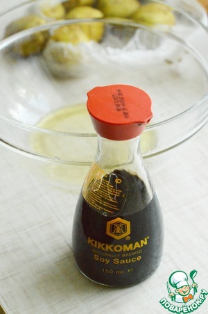 1. Шпажки замочить в воде на 30 минут. Картофель хорошо вымыть, обсушить. Сделать ножом проколы. В чашке смешать масло и соевый соус, добавить картофель, перемешать. Оставить картофель на 30 минут.