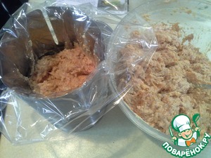 • Уплотняем фарш, плотно завязываем и укладываем ветчинницу в мультиварку на 1,5 часа. Затем остужаем сначала до комнатной температуры, а потом охлаждаем в холодильнике не менее 3 часов.