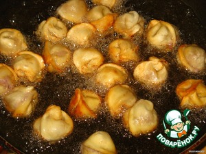 Собственно, накаляем растительное масло и бросаем в него пельмешки небольшими порциями. Обжариваем, помешивая, до золотистого цвета.