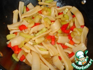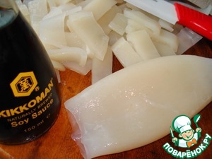 Добавляем кальмаров, соевый соус и сахар, готовим на сильном огне 2-3 минуты.