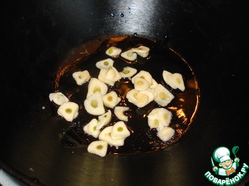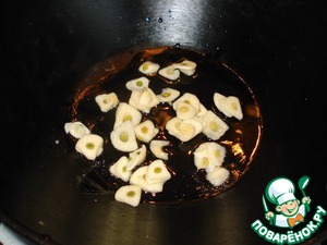 Чеснок режем тонкими пластинками. На сковороде или воке разогреваем растительное масло, обжариваем чеснок до лёгкого золотистого цвета.