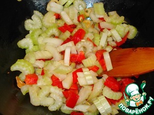 Добавляем овощи, вливаем 120 мл воды, доводим до кипения, провариваем 2 минуты.
