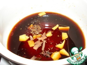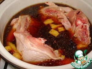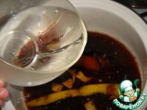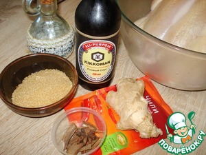 В кастрюлю налейте соевый соус, вино, растительное масло, измельченный имбирь и чеснок. Добавьте сахар, полоску цедры с лимона, перец чили (берите по вашему вкусу)