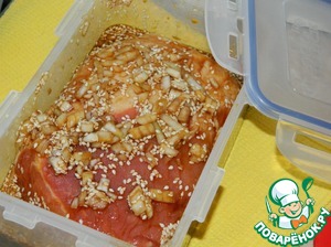 На то же количество маринада я взяла в два раз больше свинины. Половину замариновала куском согласно рецепту, а половину мелко нарезала, как на бифстроганов, и положила мариновать туда же.