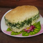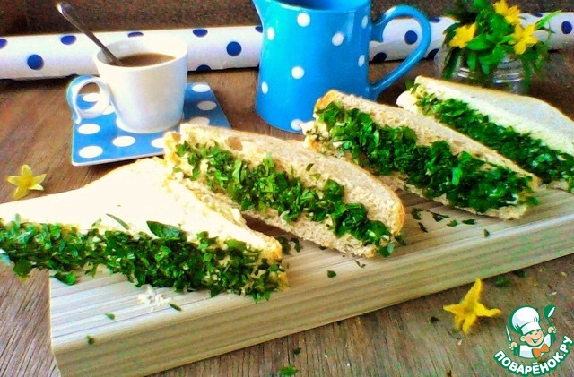 квадратные кусочки, затем разрезаем по диагонали и одну сторону бутерброда обваливаем в мелко нарезанной петрушке. И всё, оригинальные бутерброды готовы!!! Приятного аппетита!!!