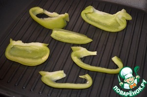 Перец порезать и обжарить на сковороде гриль без добавления масла.