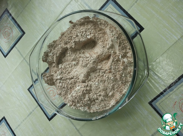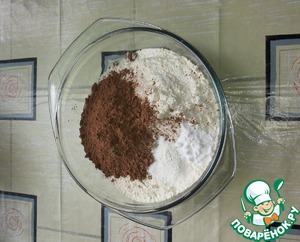 Для начала соединим все сухи ингредиенты: мука, какао, сода, разрыхлитель
