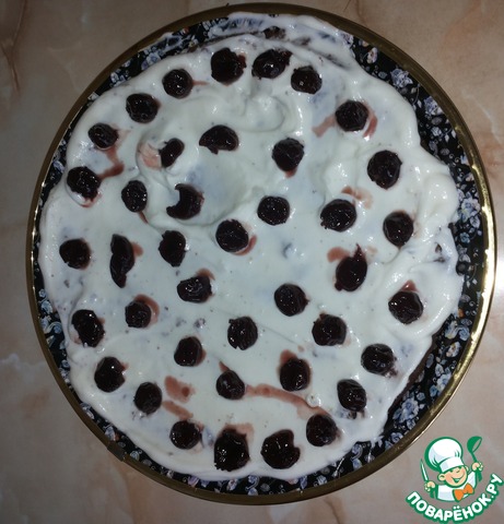 Первый корж поливаем пропиткой, затем мажем кремом и сверху ложим вишни. Вот что получается.
