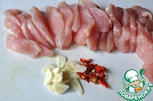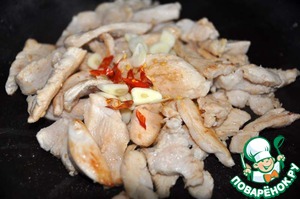 Добавляем порезанные чеснок и перец чили, перемешиваем. -