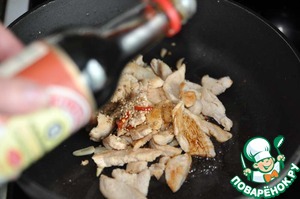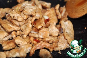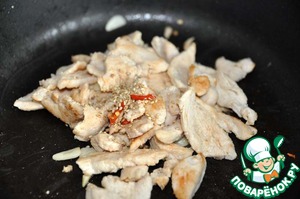 Кладём порезанное куриное филе и обжариваем, непрерывно помешивая, 2 минуты.