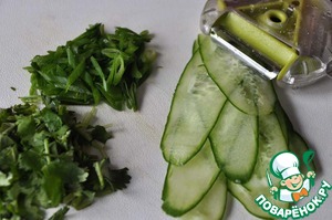 Берём огурец, нарезаем тонкими полосками с помощью овощечистки.