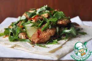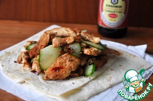 Смешиваем обжаренное куриное филе с порезанным огурцом и выкладываем на лепёшку (лаваш). -