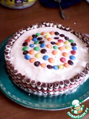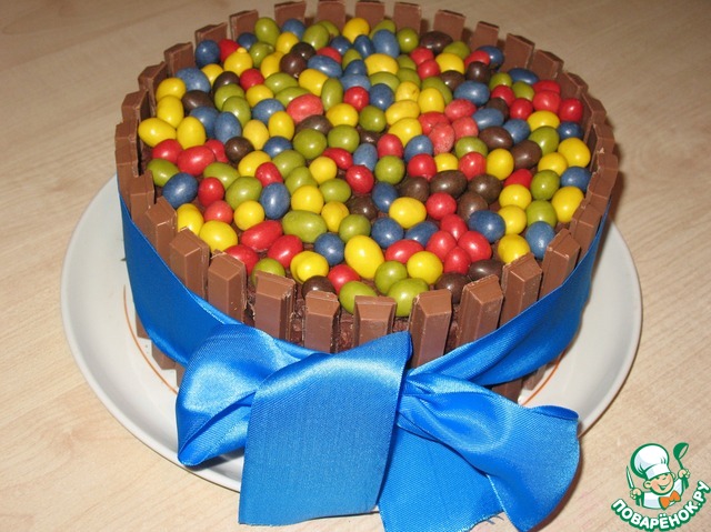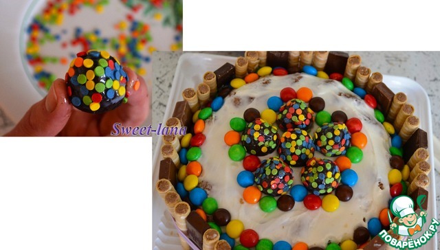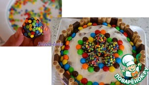 Конфетки "трюфеля" я смазала сгущенкой для липкости и посыпала присыпкой, выложила на торте в форме цветочка. Правда, именинница сказала, что нужно было 10 таких конфеток - ей же 10 лет. Вот так я прокололась:)