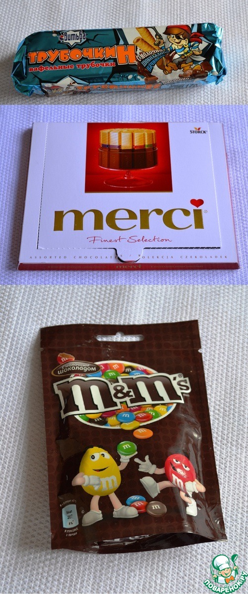 Далее я использовала вот такие вкусняшки. Можно взять только конфеты мерси, но мне захотелось разнообразить и я использовала еще трубочки.