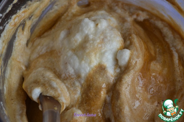 В отдельной миске взбиваем белки до крепких пиков. Все аккуратно смешиваем.