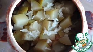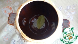 Затем достаем наши горшочки и начинаем выкладывать слоями. На дно мы кладем лавровый лист.