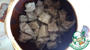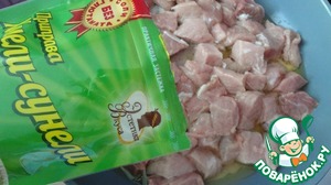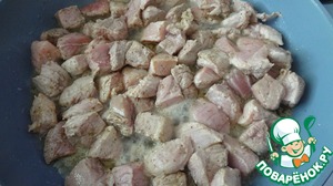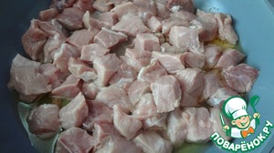 Мясо нарезаем кубиками и выкладываем на сковороду с растительным маслом.