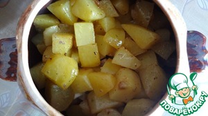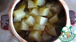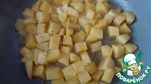 Чистим картофель, и нарезаем тоже небольшими кубиками. Выкладываем на нашу сковороду, на которой осталось немного мясной воды. Солим немного и жарим, пока вода совсем не выпарится, минут 5-7.