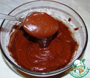 Добавляем просеянную муку с какао-порошком и разрыхлителем. Хорошо перемешиваем и получаем тесто вот такой вот консистенции.