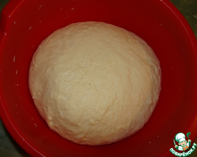 Добавить муку. Начинаем с 450 г. Мука у всех разная, поэтому даю такой промежуток в цифрах. Тесто должно быть хорошо вымешано, до однородности, лишь слегка липнуть к рукам. Не стоит его сильно забивать мукой.