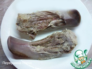 Отвариваем язык. Я делаю это так: кладу его в холодную воду (язычки у меня среднего размера) и даю закипеть, когда вода закипит, варю 5 минут и после чего сливаю воду. Язык мою и снова ставлю вариться. Процесс варки языка долгий - у меня ушло 2,5 часа. Варим на медленном огне, прикрыв крышкой, оставив щель.