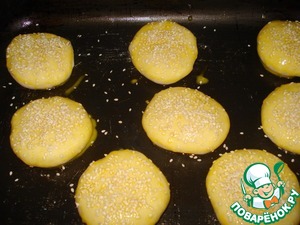 Подошедшие обмазать смесью желтка и молока и посыпать кунжутом.