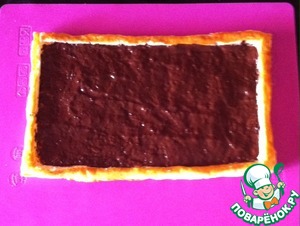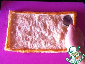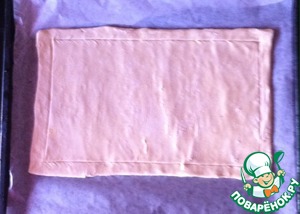 Слегка раскатаем тесто, чтобы получить прямоугольник размером30*20 см, поэтому его нужно взять в рулоне. Отступив 1 см от края ножом сделать надрез по периметру, не прорезая наш корж насквозь.