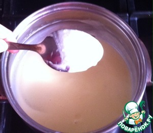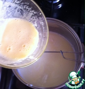 Доведём до кипения 100 мл сливок с молоком и ванилином. Затем быстро вмешаем в яичную смесь 3 ст. л. горячей сливочной смеси и вернём обратно в кастрюлю.