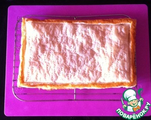 Духовку разогреем до 200 градусов и будем выпекать слоёный корж 20 минут, пока бордюр не приобретёт золотисто-коричневый цвет. Остужаем на решётке.