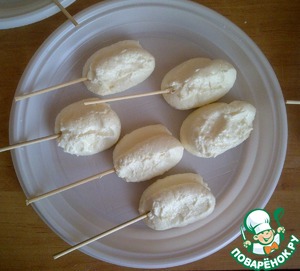 Выдавливаем на одноразовые тарелки творожную массу как нам угодно. У меня получились такие овальчики)И втыкаем в них шпажки, что бы потом удобно было в глазурь макать. И в морозилку это всё до застывания (но не замораживать!)