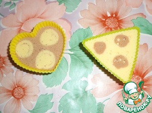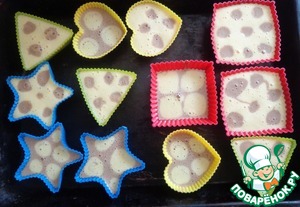 Светлым и темным тестом заполняем формочки для выпечки кексов (у меня силиконовые формочки). С помощью кондитерского шприца наносим кружочки на тесто. На светлое тесто - кружочки из темного теста, на темное - из светлого.