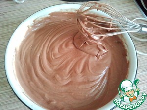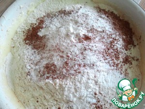 Во взбитую массу добавляем просеянную муку, какао, разрыхлитель, хорошо перемешиваем.