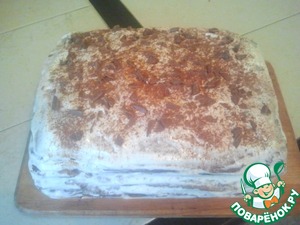 Верхний корж тоже оформляем взбитыми сливками, посыпаем порошком какао и украшаем кусочками шоколада. Отправляем в холодильник часа на 3 не меньше. Приятного чаепития. Так как я делала торт для воскресного чая, то с украшениями не заморачивалась. Но получилось вкусно!