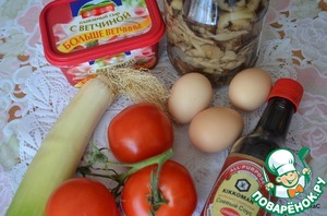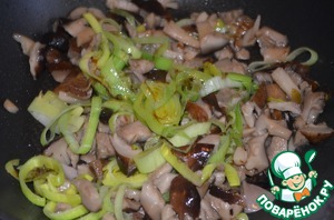 К луку добавить маринованные грибочки и слегка потушить в том соке, которые будет вытапливаться из грибов при жарке.