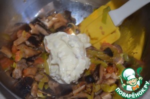 Внутренности от помидорок порезать помельче и добавить к луку с грибами. Потушить пару минут. Выключаем газ. Туда же-добавить плавленный сыр. Хорошо перемешать.
