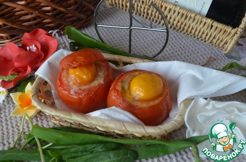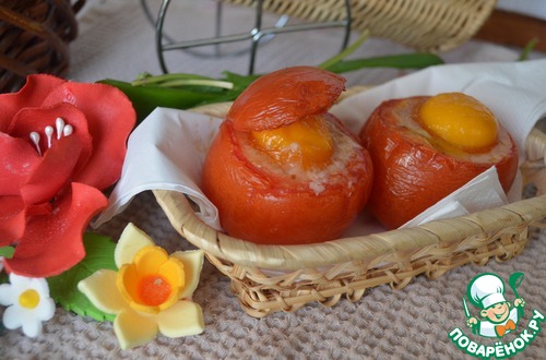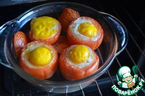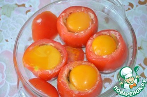Осторожно выбиваем в помидор по одному яйцу. Я яйца не солю (соли достаточно в начинке и в самих яйцах).