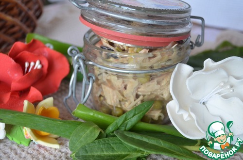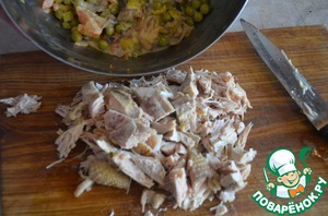 Если у Вас осталось немного начинки, смело добавляйте в нее немного зеленого горошка и вареную курицу (либо-копченое мясо, колбасу). Перемешивайте.