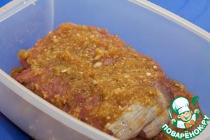 Каждый кусочек мяса немного перчу, щедро смазываю маринадом и укладываю в контейнер.