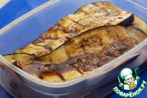 Обмакиваю в подготовленный маринад (смешать оливковое масло, бальзамик и измельченный чеснок, пропорции можно корректировать по своему вкусу) каждую обжаренную полоску баклажана, складываю в контейнер и заливаю оставшимся маринадом.