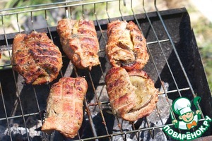 Выкладываем рулеты на решетку и обжариваем до готовности, периодически переворачивая решетку. Мясо важно не пересушить!