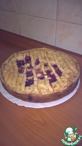 Из остатков теста сделать "решетку" и накрыть поверх начинки.