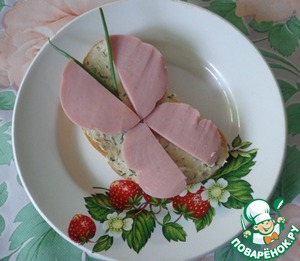 2 кружочка вареной колбасы разрезать пополам, уложить на батон в виде крыльев бабочки.