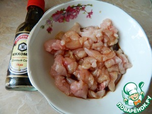 Для начинки мелко нарезать куриное филе и замариновать соевым соусом минут на 30-40.