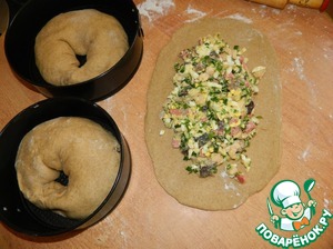 Тесто поделить на 3 части. Раскатать в овальную лепешку, выложить начинку, защипнуть тесто сверху и по бокам. Соединить в кольцо и выложить в форму. Дать подойти минут 30-40 и выпекать при 210 С минут 30.