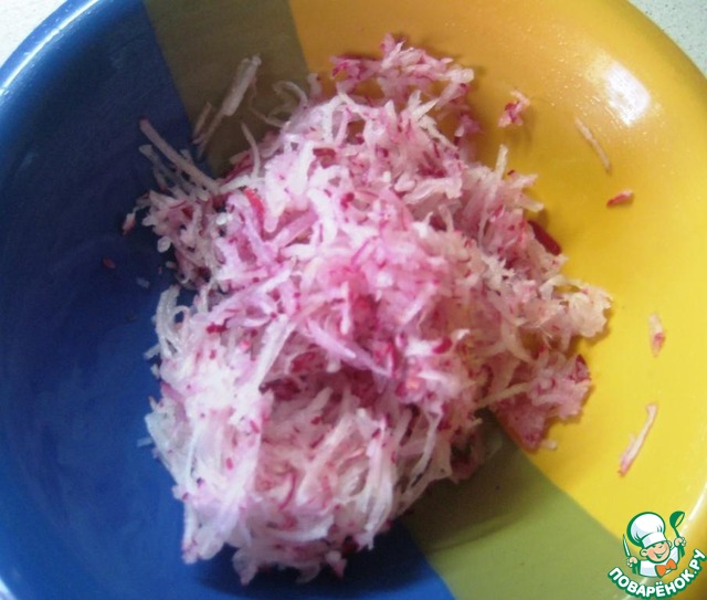 Редис отжать от жидкости. Жидкость пока не выливать, она может нам пригодится.