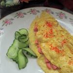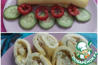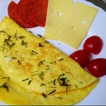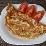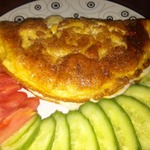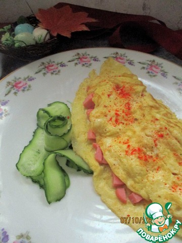 Огонь выключаем. При желании можете добавить на одну сторону омлета любую начинку и аккуратно лопаточкой поддеть омлет с одной стороны и сложить вдвое. Я в ингредиентах не указывала варианты начинки, тут уж на ваше усмотрение, можно просто сыром притрусить. Я же добавила ветчину, грибы, сыр и помидор.