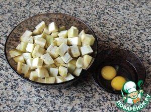 Баклажаны очистить от кожуры, порезать крупными кубиками. Не солить (современные сорта не горчат)! Яйца "разболтать" и добавить к баклажанам. Тщательно перемешать и отправить в холодильник на 1-2 часа.