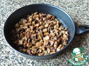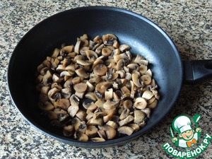 Грибы выложить на сухую сковороду и потушить под крышкой до испарения выделившегося сока 7-10 минут. Выложить.